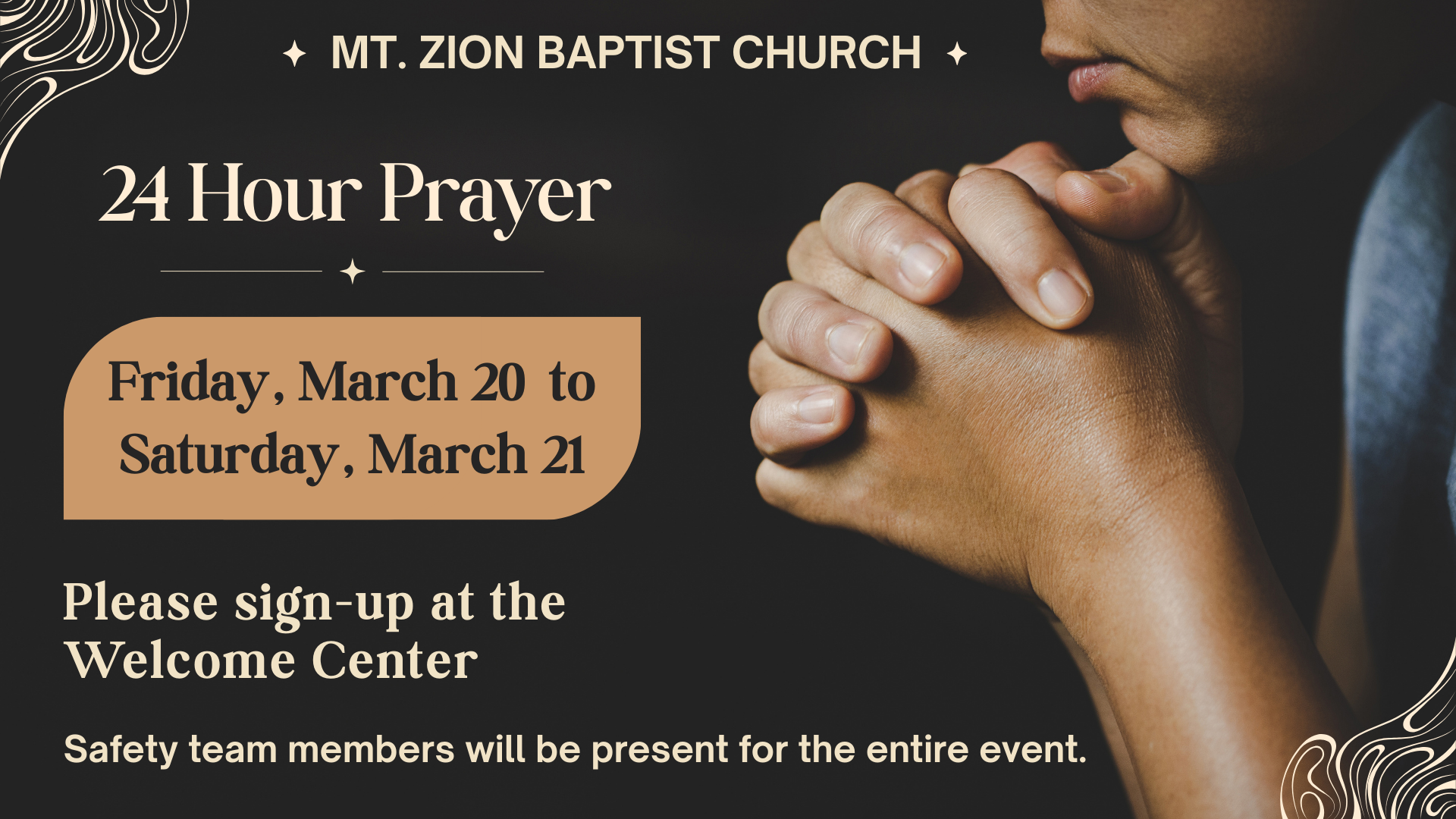 We invite all members to join us for a special 24-hour prayer for Mt. Zion. Let’s come together in faith, seeking God’s guidance and blessing over our church.