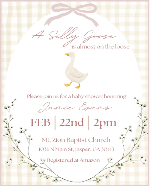 Join us in celebrating Jamie Evans at a baby shower on Sunday, February 22, at 2 PM in the Mt. Zion Fireside Room!